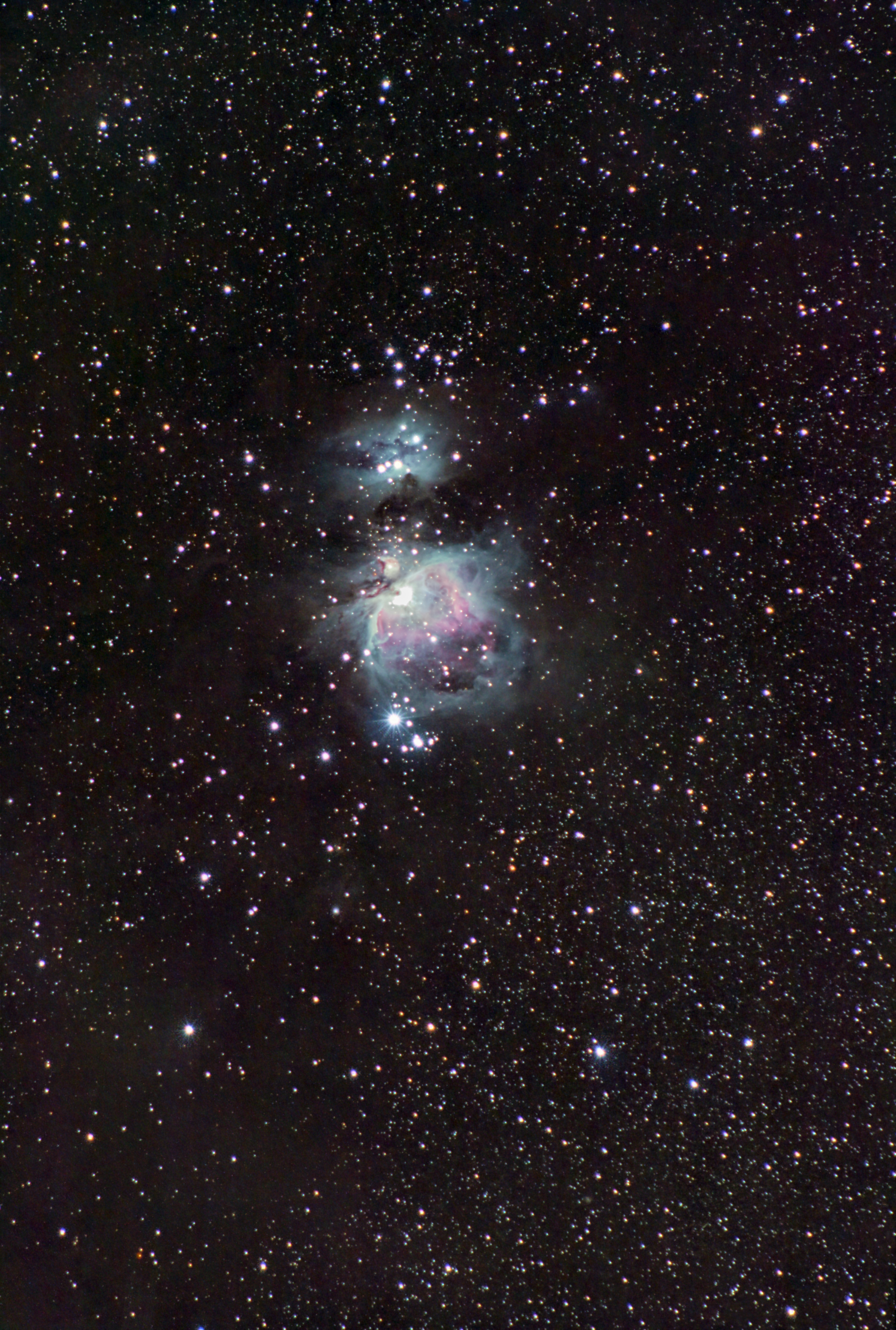 M42 200mm Der Orionnebel (M42) im weiten Feld (200mm). Die Aufnahme zeigt nicht nur den hellen Nebel selbst, sondern auch die großflächigen, schwachen Staubwolken der Umgebung im "Schwertgehänge" des Orion, die den gesamten Nebelkomplex einhüllen.