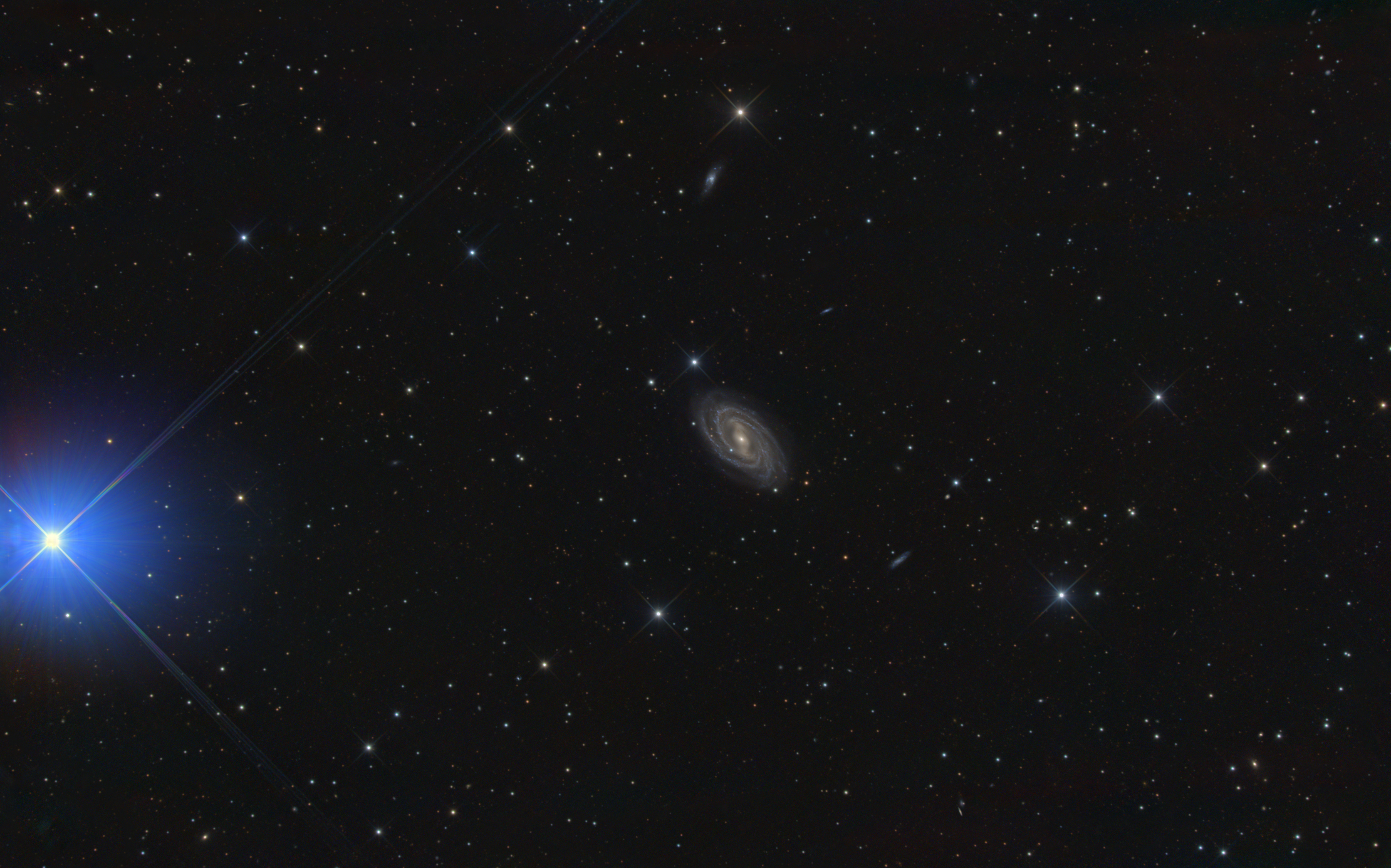 Diese RGB-Aufnahme bei hoher Brennweite zeigt die Balkenspiralgalaxie M109 in direkter Nachbarschaft zum strahlenden Stern Phecda (gamma Ursae Majoris). Während die Galaxie ihre filigranen Spiralarme und Staubstrukturen offenbart, sorgt der enorme Helligkeitsunterschied zu Phecda für einen spektakulären Kontrast und eine besondere Tiefe im Bild.