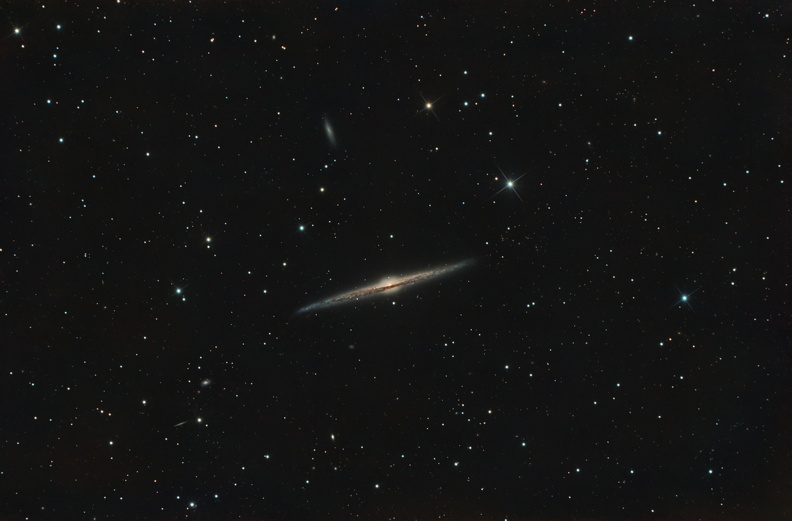 Diese detailreiche RGB-Aufnahme bei hoher Brennweite offenbart die prächtige Struktur von NGC 3184, der „Kleinen Pinwheel-Galaxie“. In natürlichem Farblicht leuchten die markanten blauen Spiralarme voller junger Sterne und die rötlichen H-II-Regionen innerhalb der weiten galaktischen Scheibe. Oben rechts findet sich der 1,25 Milliarden Lichtjahre entfernte Galaxienhaufen Abell 971