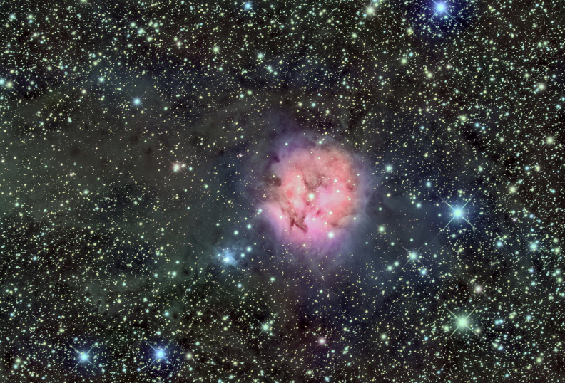 NGC 2175: Oben rechts befindet sich dieser Emissionsnebel. Die Aufnahme hebt die scharfen Ionisationskanten hervor, die durch die hochenergetische Strahlung der eingebetteten Sterne entstehen.