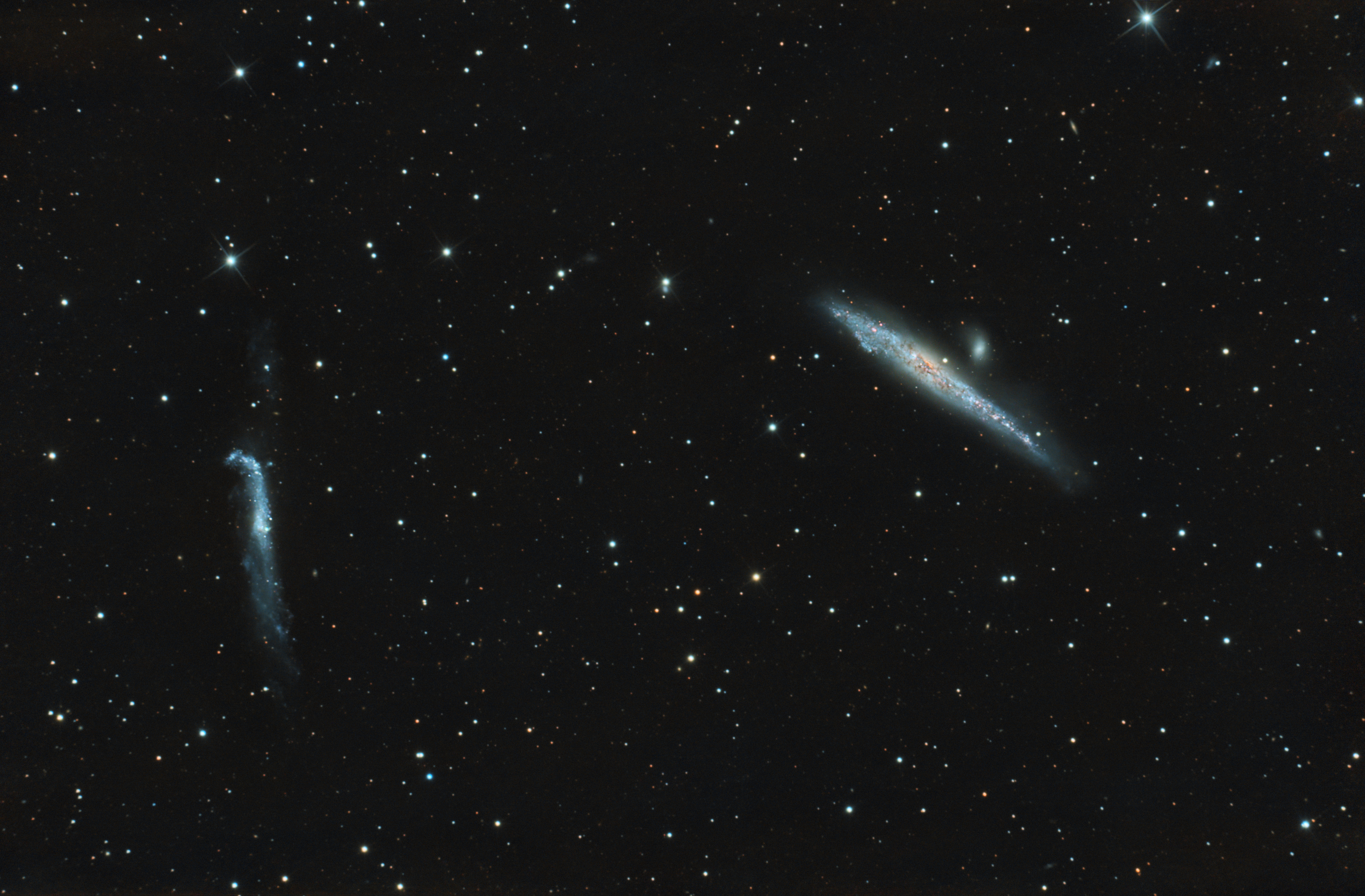 Ein kosmisches Duo in den Jagdhunden: Die Wal-Galaxie (NGC 4631) und die Hockey-Schläger-Galaxie (NGC 4656). Die verzerrten Formen bezeugen die gravitative Wechselwirkung zwischen diesen beiden benachbarten Galaxien.