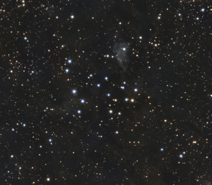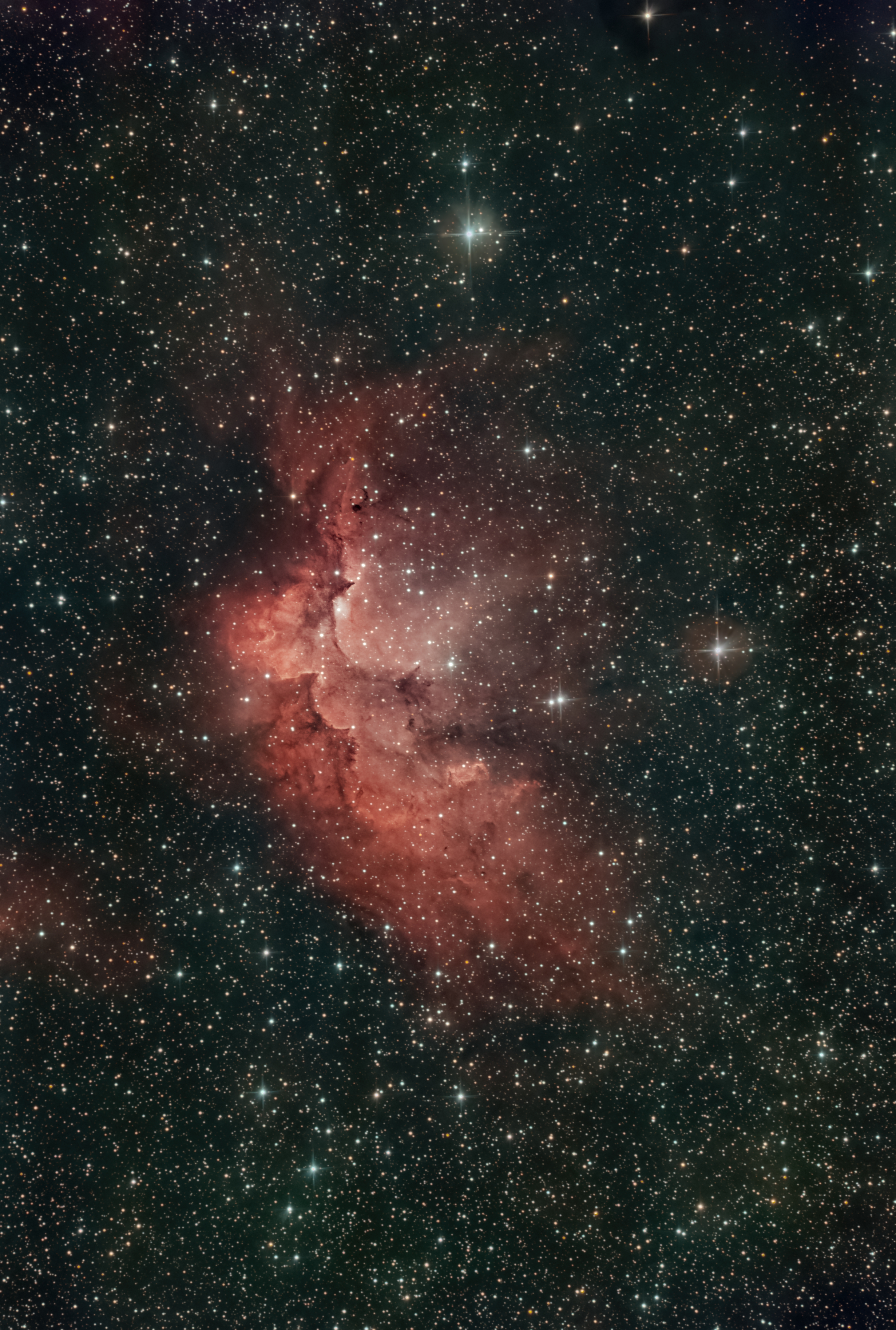 Der Zauberernebel (NGC 7380) im Sternbild Kepheus. Das Bild zeigt den offenen Sternhaufen, der in den leuchtenden Emissionsnebel eingebettet ist. Die komplexen Gas- und Staubstrukturen erinnern mit etwas Fantasie an die Silhouette eines Zauberers.