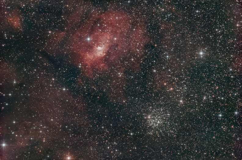 Ein weites Feld an der Grenze von Kassiopeia und Kepheus. Das Bild spannt den Bogen vom reichen offenen Sternhaufen M52 bis zum mystischen Zauberernebel (NGC 7380) und zeigt die sternreiche Milchstraßenregion, die diese beiden Objekte verbindet.
