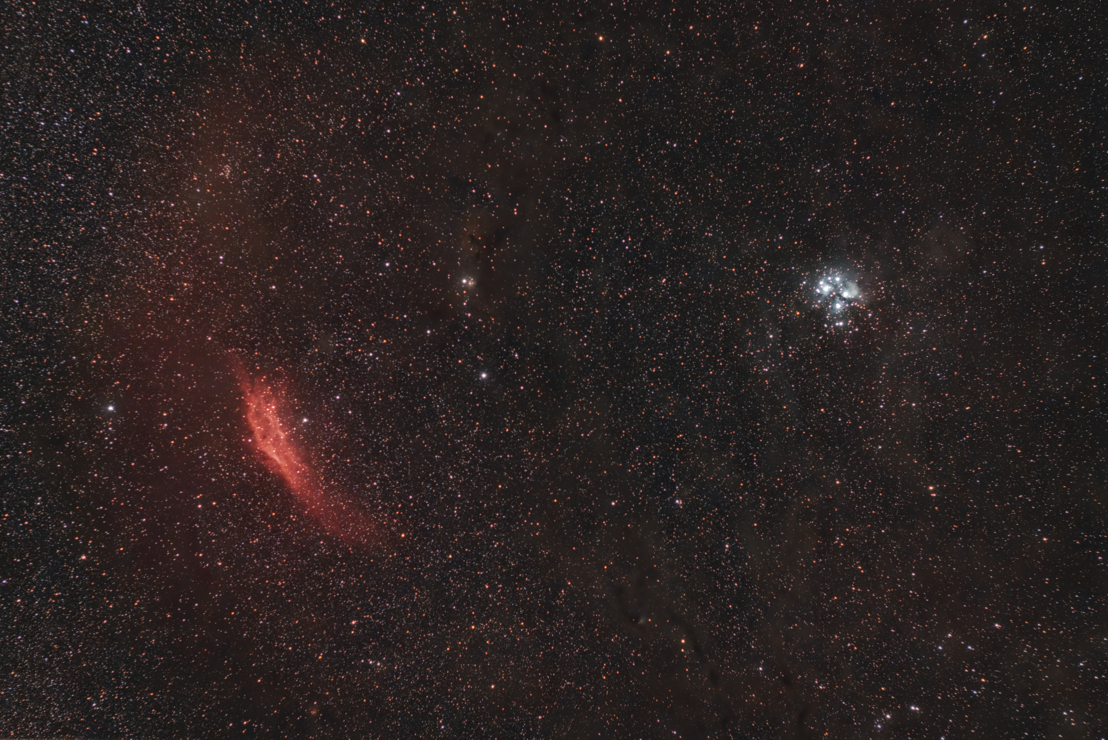 Eine beeindruckende Weitfeldaufnahme, die den offenen Sternhaufen der Plejaden (M45) im Stier mit dem rot leuchtenden Kaliforniennebel (NGC 1499) im Perseus verbindet. Das Bild zeigt die kosmische Nachbarschaft dieser beiden ikonischen Winterobjekte in einem großen Bildfeld.