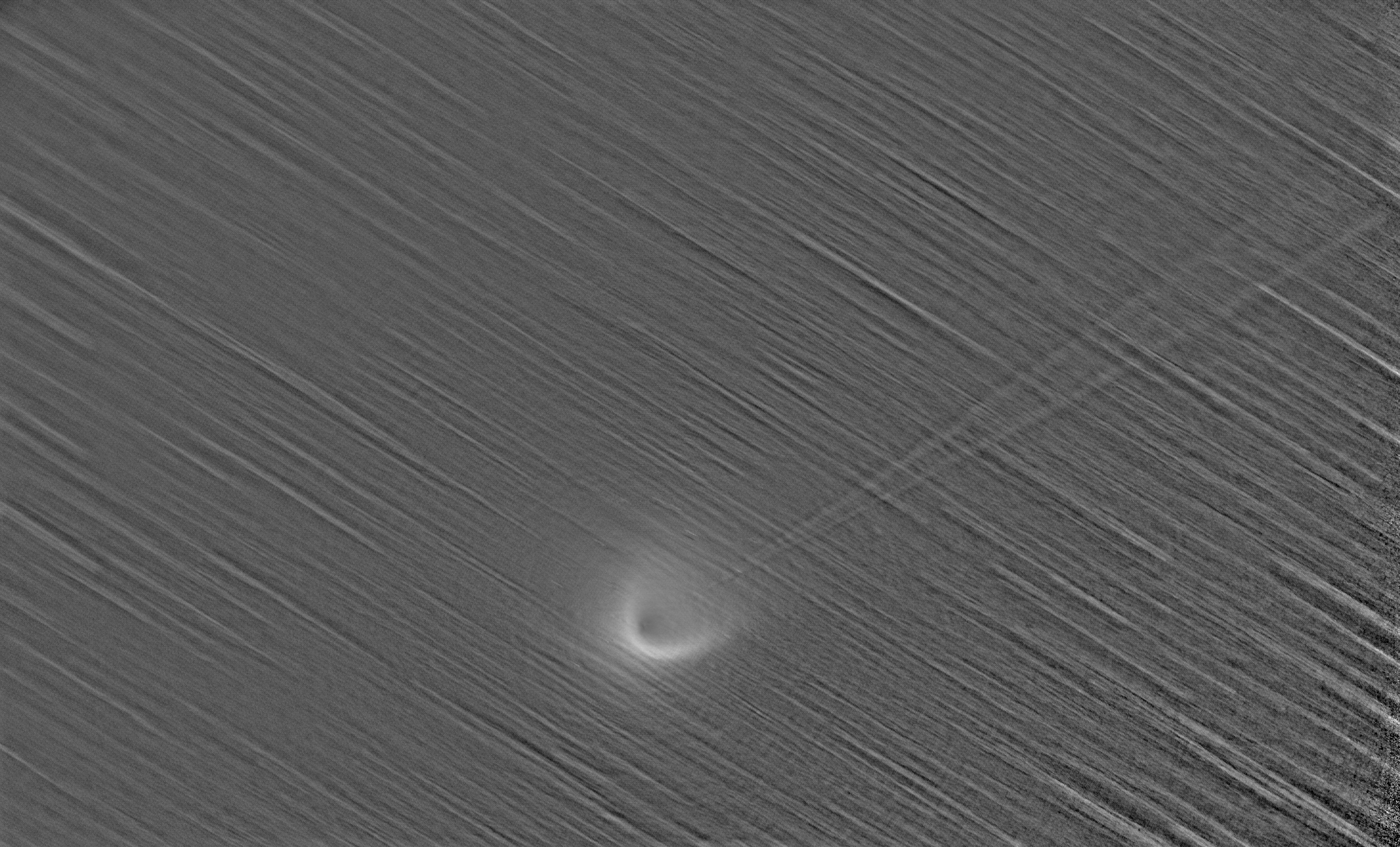 Eine spezialgefilterte Langzeitbelichtung des Kometen ZTF. Durch die Filterung (z.B. zur Lichtverschmutzungsreduktion oder Kontraststeigerung) werden spezifische Strukturen der Koma und des Schweifs deutlicher vom Hintergrund abgehoben.